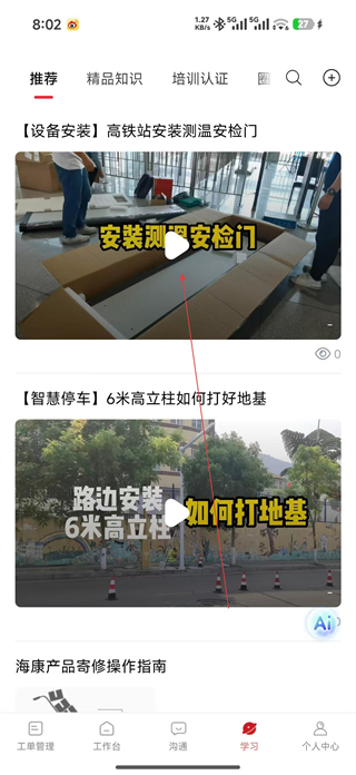 2、登錄后進入學習頁面,可瀏覽推薦的設備安裝、智慧停車等知識內容,選擇感興趣的視頻,點擊進入其播放頁面。
