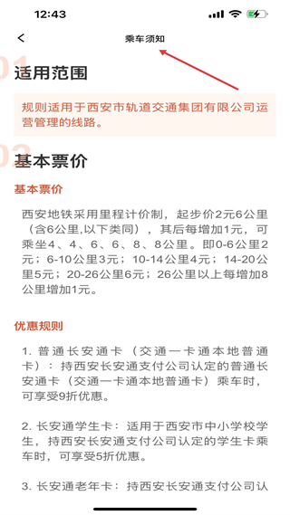4、乘車須知頁,適用西安軌道交通線路,說明里程計價制票價和普通卡、學生卡等優惠規則。