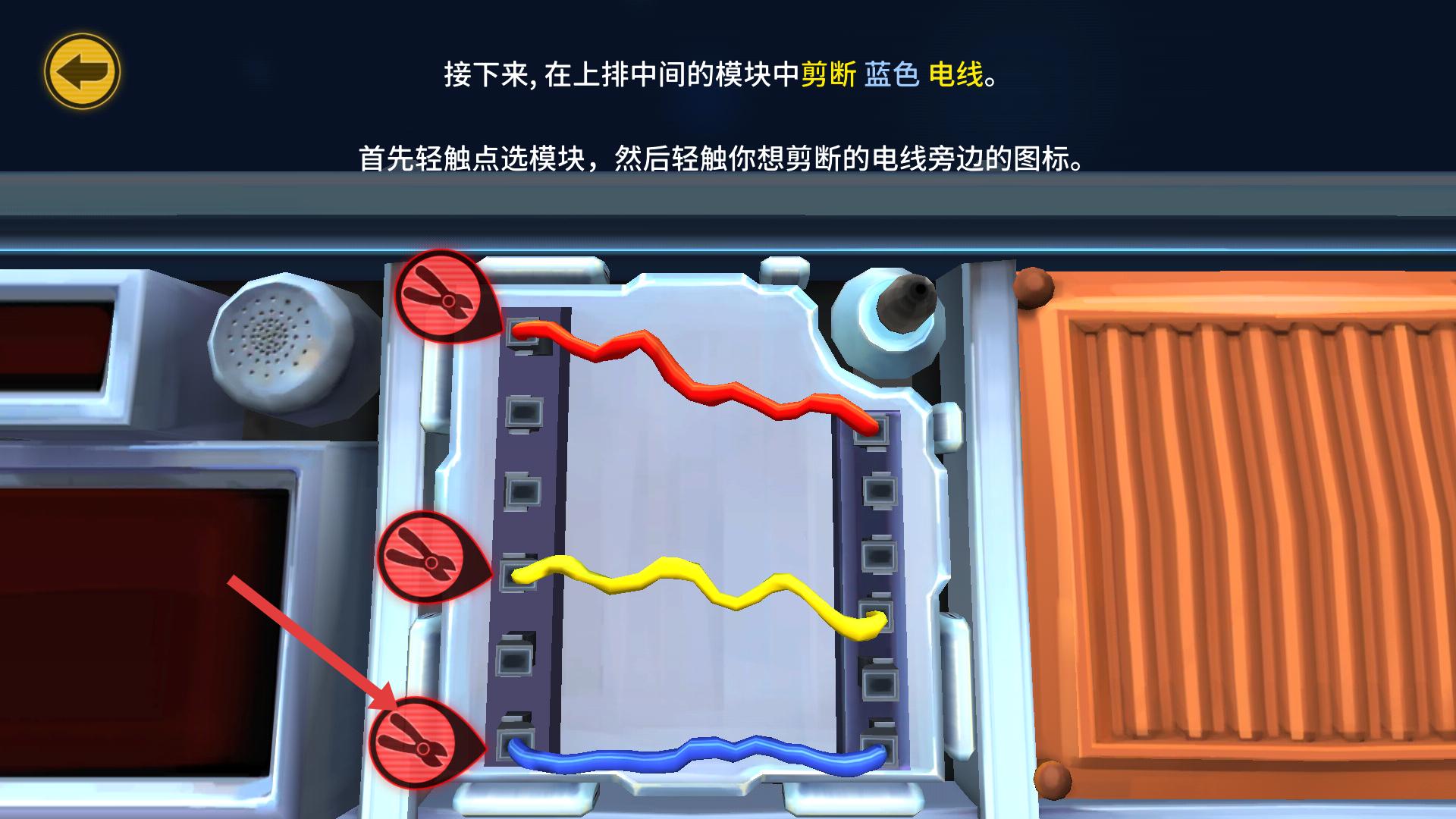 2、根據提示,在上排中間模塊里,先輕觸點選模塊,再輕觸藍色電線旁的圖標,剪斷藍色電線,完成這一步操作。