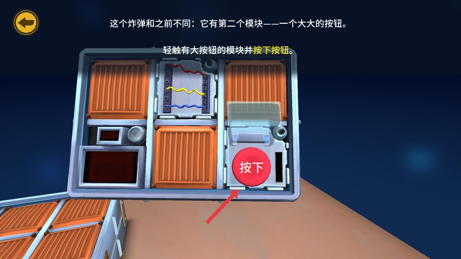 3、遇到帶大按鈕的炸彈模塊,輕觸該模塊,然后按下紅色按鈕,進行相應的拆彈步驟。