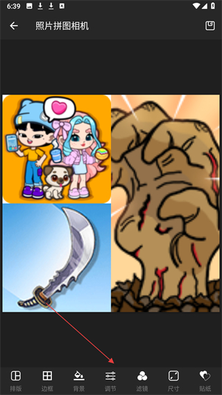 3、在拼圖過程中可對拼圖的排版、邊框、背景、濾鏡、尺寸等進行調節,還能添加貼紙,讓拼圖更具個性化。
