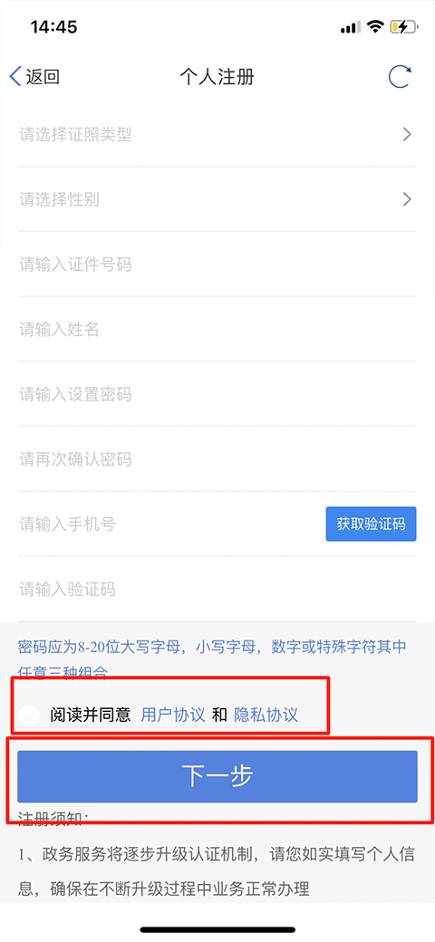 3、依次填寫證照類型、性別等信息,設密碼并確認,填手機號、驗證碼,勾選協議后點下一步。