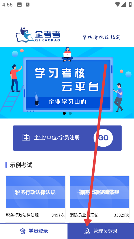 2、進入APP主界面可看到下方有學員登錄和管理員登錄選項,根據自身身份點擊相應入口,若為管理員點擊管理員登錄。