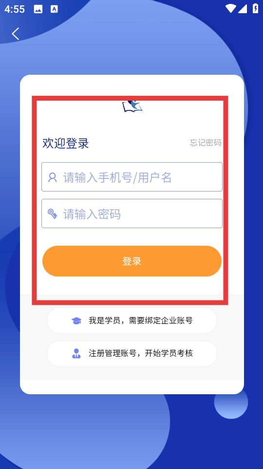 3、進入登錄頁面在對應輸入框中輸入手機號用戶名和密碼點擊登錄即可,若忘記密碼點擊忘記密碼進行找回,若為學員且需綁定企業賬號。