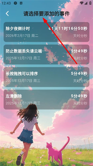 4、進入事件選擇頁面,可挑選已有的倒計時事件,選定后保存組件,即可將該事件以對應組件樣式添加到桌面,直觀查看時間倒計時。