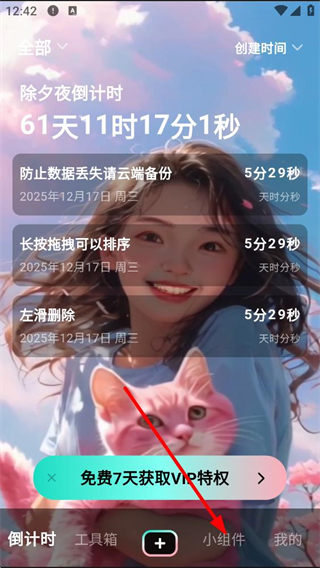 1、一古倒計時主界面,點擊底部組件按鈕,可進入組件選擇頁面,挑選不同樣式的倒計時組件來美化時間展示。