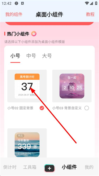 2、進入組件頁面的桌面小組件分類,可選擇小號、中號、大號等尺寸的組件模板,選定后點擊對應組件即可進入配置流程。