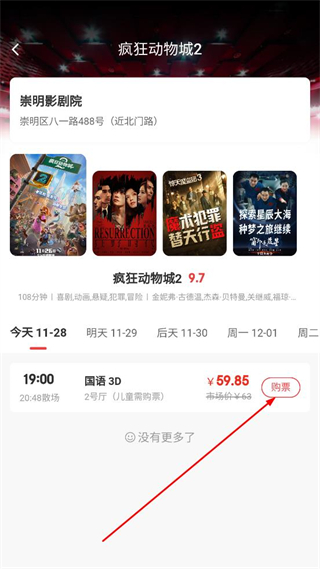 3、進入選定影片的詳情頁面查看不同影院的排片信息,了解各影院的位置及對應的票價,挑選合適的影院。