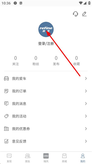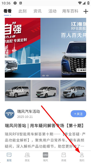 1、進入瑞風汽車的看看頁面,可瀏覽汽車資訊、活動等內容,底部有發現、朋友等功能按鈕,點擊我的進入個人中心頁面。