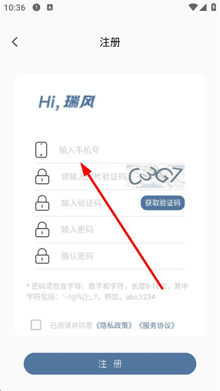 4、進入注冊頁面,需依次輸入手機號、圖片驗證碼、短信驗證碼,再設置符合要求的密碼并確認,勾選協議后點擊注冊完成賬號創建。