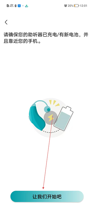 4、確認助聽器已充電或裝有新電池并靠近手機,點擊讓我們開始吧按鈕,按照引導流程推進助聽器與手機的連接。