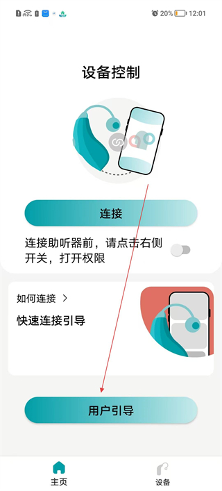 2、登錄后進入設備頁面,查看設備控制相關內容,點擊用戶引導按鈕,進入連接引導界面,準備選擇對應的助聽器類型。