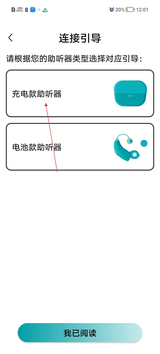 3、在連接引導頁面,根據自身助聽器類型選擇充電款或電池款,確認選擇后點擊我已閱讀按鈕,進入下一步連接準備界面。