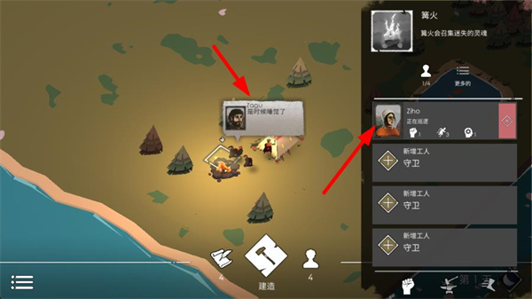2、完成守衛派遣后,界面會顯示對應提示,該工人會留在篝火區域,既休息也履行守衛職能,保障營地的安全。