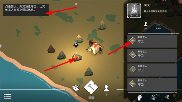 1、界面提示點擊篝火,向其派遣守衛,在右側界面選擇守衛選項完成指派,讓該工人在篝火旁休息,同時承擔守衛職責。