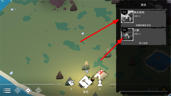 3、進入建造界面,可看到樵夫營地等建筑選項,滿足對應材料條件后,即可選擇該建筑進行建造,拓展營地的功能設施。
