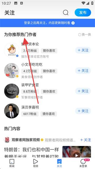 1、進入關注頁面,可查看為你推薦的熱門作者,如娛樂資本論、小文等吃吃吃等,選擇感興趣的作者點擊關注。