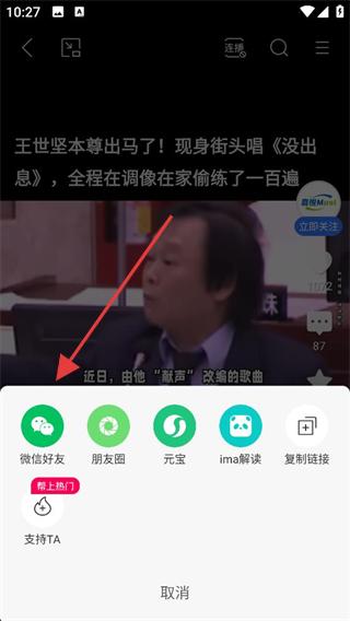 4、在分享頁面,可選擇微信好友、朋友圈等分享渠道,也可選擇復制鏈接分享,還能支持該視頻創作者。