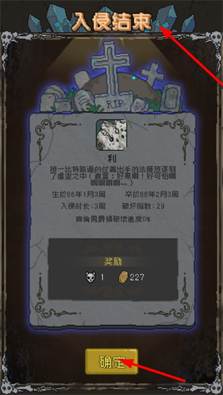4、入侵結束后會顯示怪物的入侵時長破壞指數等信息,還能獲得相應獎勵,點擊確定按鈕,關閉界面并結束本次入侵流程。