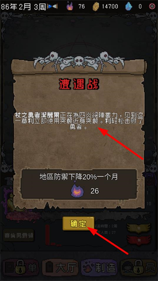 3、遭遇戰后會顯示地區防御下降的結果,查看對應的數值變化后,點擊確定按鈕,完成該界面的操作并推進流程。