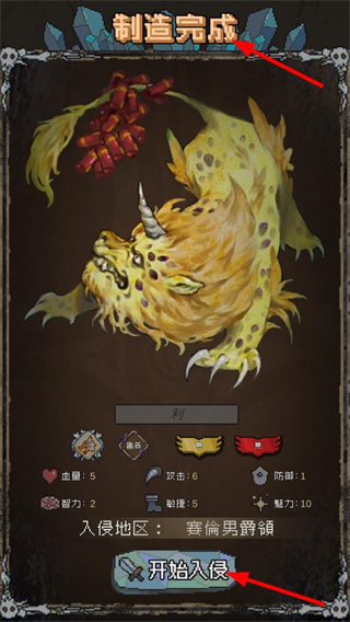 1、看到制造完成界面,可查看怪物的屬性數值與入侵地區,點擊開始入侵按鈕,即可啟動怪物對目標地區的入侵行動。