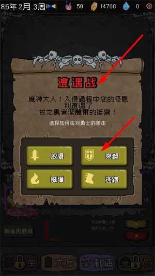 2、入侵的過程進入遭遇戰界面,會提示怪物遭遇了勇者的棟梁,可選擇威嚇突破催眠避陽的方式,應對勇者的攻擊。