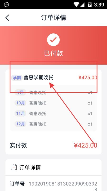 1、付款的托管服務,如普惠學期晚托及各月明細、實付金額,方便家長核對繳費及托管時段,把控消費情況。