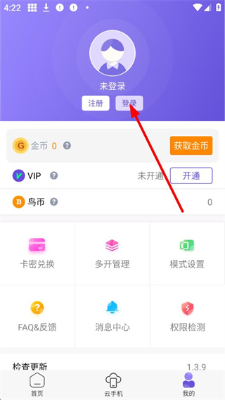 2、點擊我的入口,進入個人界面,顯示未登錄狀態,可選擇注冊或登錄,登錄后可查看金幣、VIP、鳥幣等信息,使用卡密兌換、多開管理等功能。