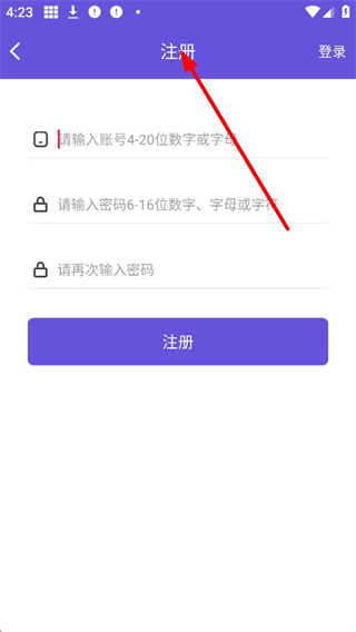 4、注冊界面,輸入數字或字母的賬號,設置數字、字母或字符的密碼并再次確認,點擊注冊按鈕完成賬號注冊。