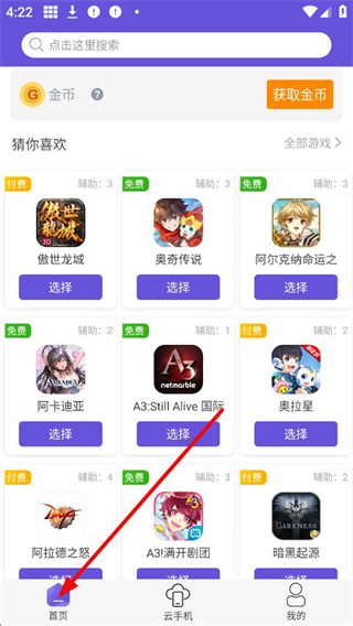 1、進入游戲輔助平臺首頁,有搜索功能和猜你喜歡的游戲推薦板塊,展示傲世龍城、奧奇傳說等游戲,可選擇游戲使用輔助功能。