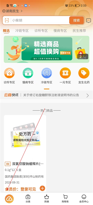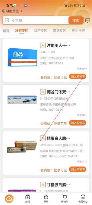 4、選擇目標板塊如冷鏈專區,進入對應的商品列表頁面,查看相關藥品信息,可進行加入購物車等。