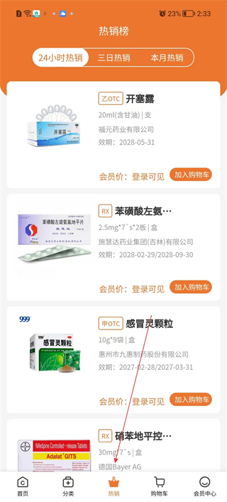 3、點擊熱銷榜,查看24小時熱榜等榜單內容,瀏覽展示的藥品商品,了解其效期等信息。