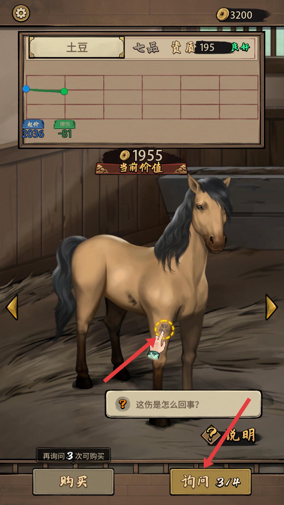 4、相馬時,可查看馬匹價格變化和當前價值,還能點擊馬匹傷口詢問情況,多次詢問后滿足條件即可購買。