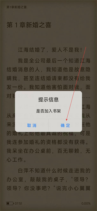 4、在閱讀界面的提示彈窗中選擇確定按鈕,將鉆戒加入書架,方便后續快速找到該小說,繼續進行閱讀。