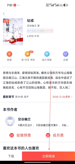 2、在女生熱銷榜中選擇鉆戒這本小說,點擊進入詳情頁面,查看書籍的作者字數等信息,了解小說的核心劇情簡介。