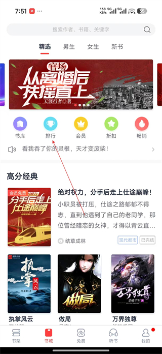 1、打開翻閱小說app,進入書城頁面,瀏覽精選板塊的內容,點擊排行選項,切換至女生頻道的排行榜,查看熱銷榜中的小說列表。