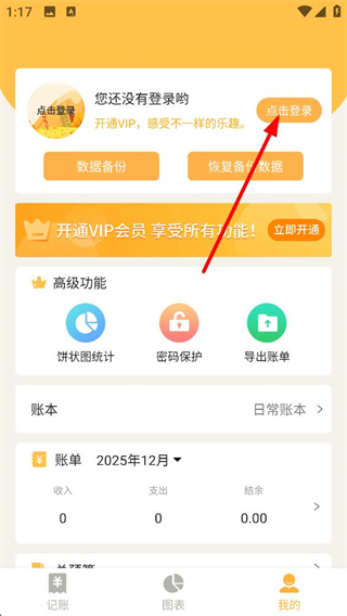 3、進入我的頁面,點擊登錄,可備份數據、開VIP,用高級功能,管理賬本信息。