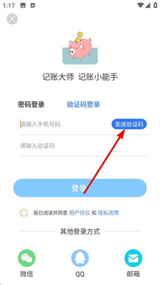 4、切換至驗證碼登錄方式,輸入手機號碼后點擊發送驗證碼,獲取并填寫驗證碼,勾選協議后點擊登錄,即可完成賬號登錄操作。