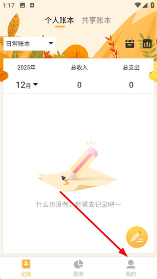 1、進入應用記賬頁面可查看個人賬本的收支統計,當前暫無記錄時可點擊記錄按鈕添加賬目,還能切換共享賬本管理共同收支。