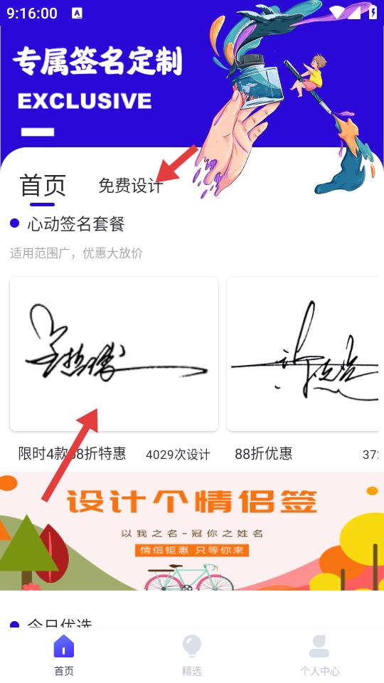 1、首頁陳列心動簽名套餐,展示多款風格簽名示例,標注限時68折、88折等優惠與設計次數,還推出設計個情侶簽專題,搭配浪漫文案與插畫。