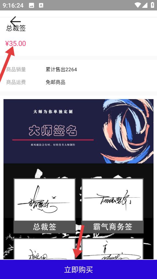 3、商品頁如總裁簽售價35元且免郵,累計售出2264單,強調大師單獨定制,展示總裁簽、霸氣商務簽等案例,下方立即購買按鈕便捷。