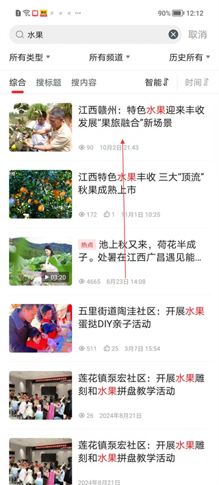2、登錄后進入搜索頁面在搜索框輸入水果關鍵詞,瀏覽搜索結果,選擇感興趣的資訊文章,點擊進入查看詳細內容了解相關信息。