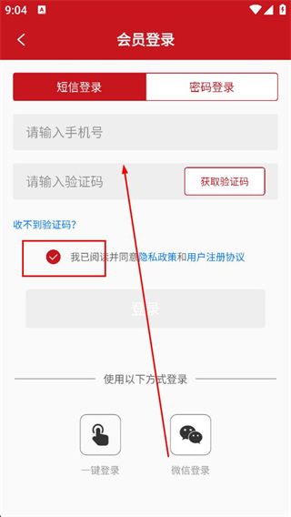 3、在個人中心的登錄頁面,選擇短信登錄或密碼登錄方式,同時勾選我已閱讀并同意隱私政策和用戶注冊協議復選框,完成后點擊登錄按鈕,完成登錄操作。