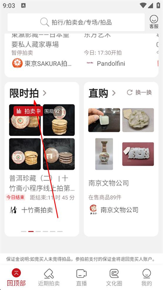 2、登錄后進入主界面找到限時拍板塊,瀏覽展示的拍品推薦內容,挑選感興趣的拍品,點擊進入該拍品的詳情頁面查看信息。