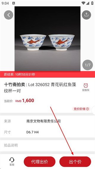 4、在拍品詳情頁找到出個價按鈕,點擊該按鈕,按照頁面提示輸入出價金額,完成出價,參與該拍品的拍賣競價流程。
