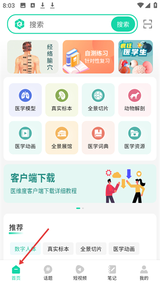 2、首頁有搜索欄,還有醫學模型、真實標本等功能入口,可下載客戶端,推薦數字人體等板塊,助力醫學學習。