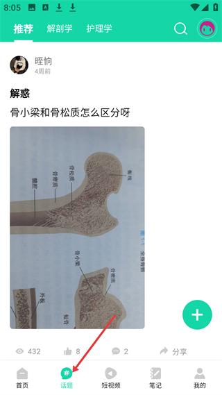 3、話題頁有推薦、解剖學等分類,用戶咥恂4周前發骨小梁和骨松質怎么區分的解惑內容,方便醫學交流。