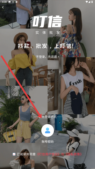 1、登錄引導頁以實體批發找款、批發,上叮信為宣傳語,展示多樣服裝穿搭,有免登錄方式、賬號密碼登錄選項,吸引用戶快速進入批發找款流程。