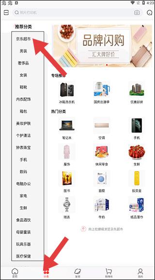 3、首頁頂部有搜索欄推薦分類,含京東超市、男裝等多品類,品牌閃購板塊展示優惠活動,熱門分類涵蓋冰箱洗衣機等商品,方便用戶查找所需。