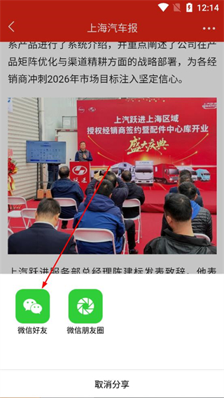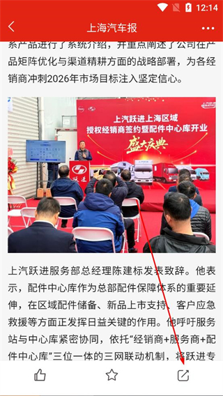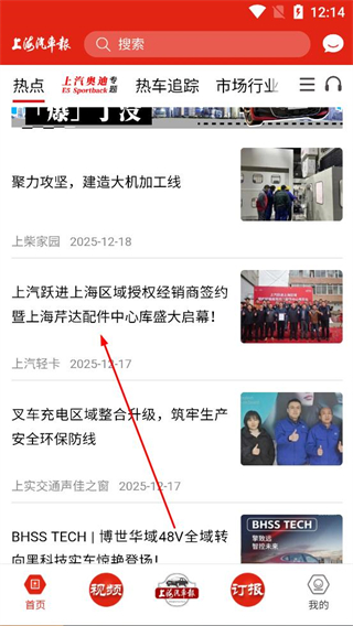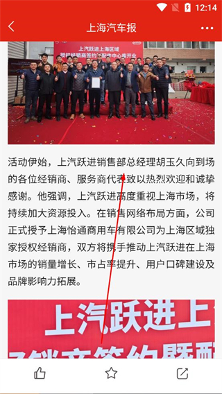 1、打開上海汽車報軟件,進入首頁熱點板塊,選擇上汽躍進上海區域授權經銷商簽約的資訊,點擊進入詳情頁面。